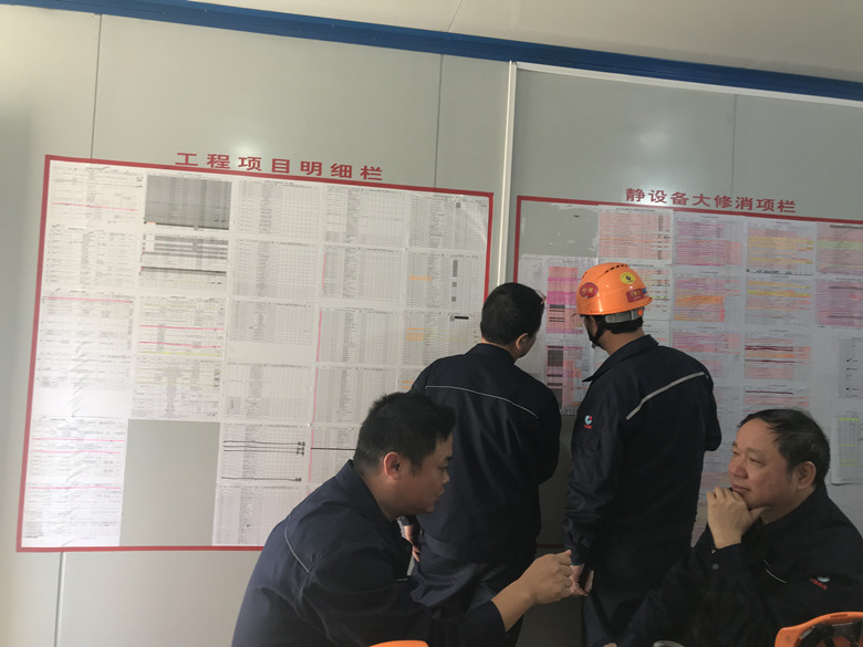 劉董事長一行從2#大門進(jìn)入裝置,映入眼簾的是一支支辛勤勞動、細(xì)致嚴(yán)謹(jǐn)?shù)臋z修隊(duì)伍。每當(dāng)經(jīng)過我公司將士檢修的裝置時(shí),副指揮王建明就會一一介紹該區(qū)域總體的檢修內(nèi)容、參檢專業(yè)、當(dāng)前進(jìn)度和關(guān)鍵重點(diǎn)項(xiàng)目及困難點(diǎn)。對于現(xiàn)場標(biāo)準(zhǔn)化的作業(yè)和嚴(yán)格的安全管理,劉董事長頻頻點(diǎn)頭,并表示,檢修進(jìn)入關(guān)鍵時(shí)期,切記要強(qiáng)化管理,全局督查,全力以赴搞好此次檢修工作,確保安全、質(zhì)量、進(jìn)度全面受控。
